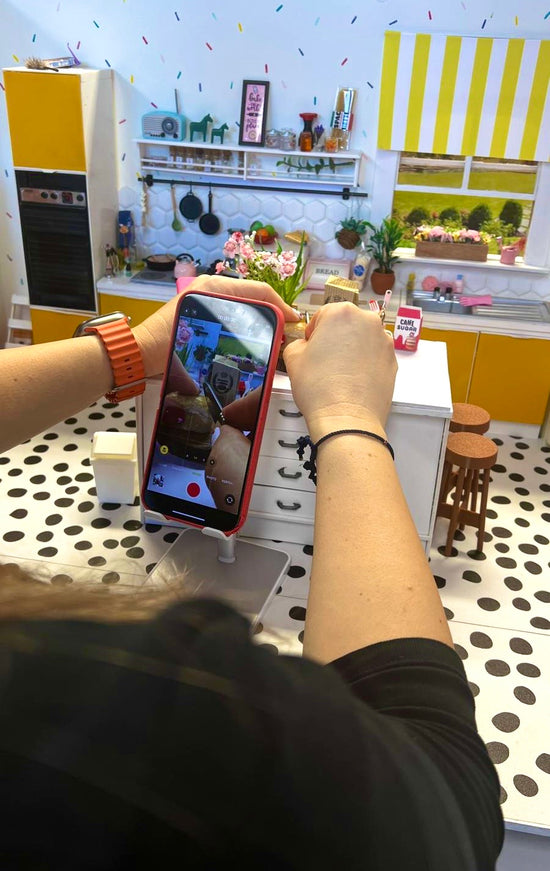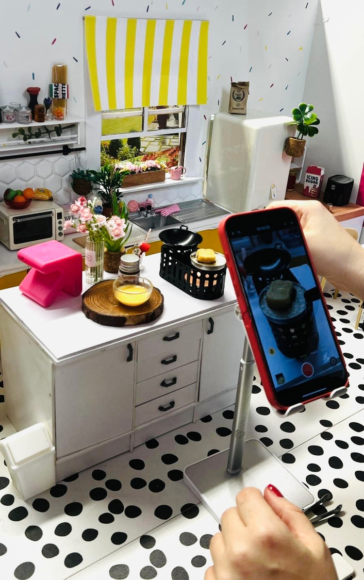 Mr. Mini worked in one room and I the other, talking to followers on lives and whispering when Mr. Mini was near the door. I transformed my photography Lightbox into a miniature kitchen, complete with tiny furniture and a working stove. The lid came down on it each night, and Mr Mini never thought to look in.