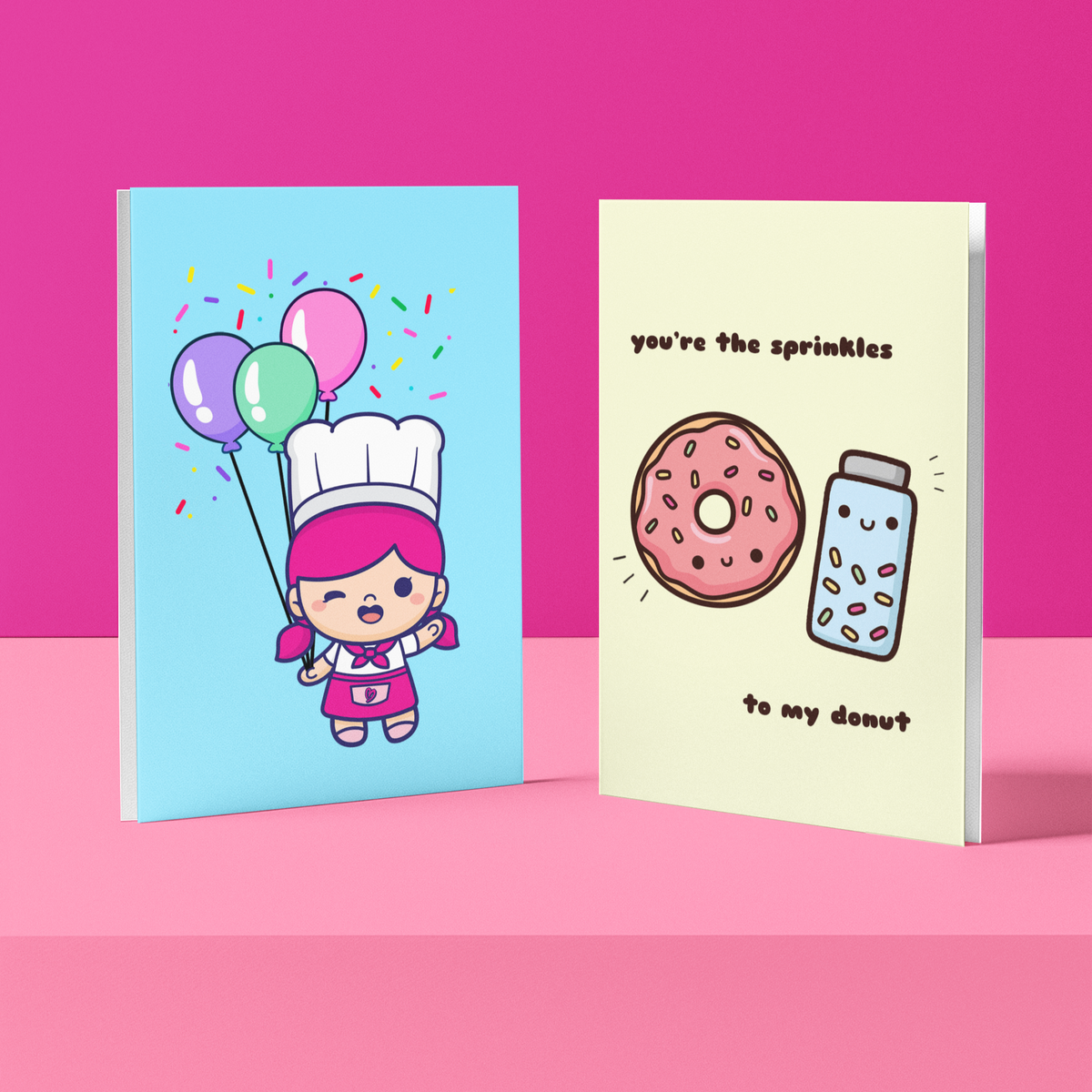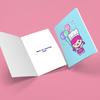 The front of the card features Mini B holding balloons and sprinkled with confetti, with a message inside that reads 'have an amazing day!'
